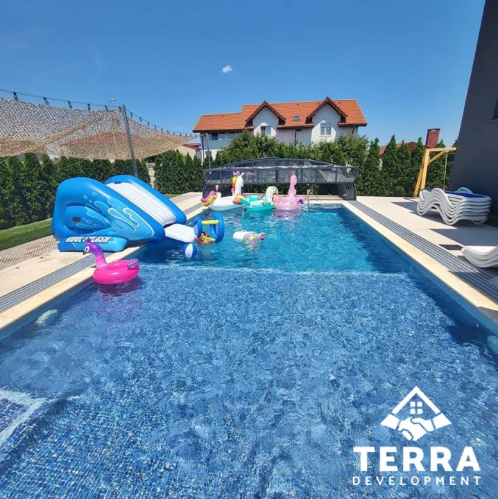 Facilități & tehnologii de top - Pompă de căldură pentru casă și piscină, încălzire în pardoseală, piscină încălzită, sistem premium de ventilație cu recuperare de căldură, inclusiv sitem de incalzire cu centrala pe gaz, foișor complet echipat cu șemineu multifuncțional, pat încălzit, cuptor și plită, sistem integrat pentru producerea apei calde menajere.